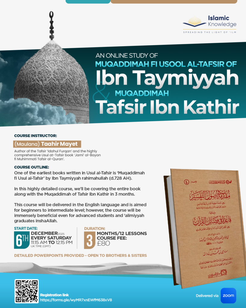 Course Instructor: (Maulana) Taahir Mayet – Author of the Tafsir ‘Idahul Furqan’ and the highly comprehensive Usul at-Tafsir book ‘Jami’ al-Bayan fi Muhimmati Tafsir al-Quran’